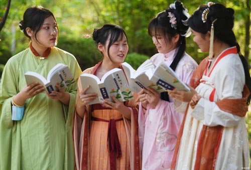 4月20日,在亳州職業技術學院,大學生們身著古裝閱讀各類書籍。當日,學院開展“著古裝 誦經典”迎接4月23日“世界讀書日”活動,營造