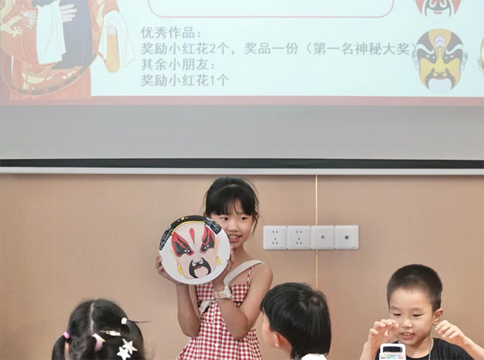 創作完成后,每個小朋友都興奮地展示自己的作品。接著,由老師們投票選出了6個優秀作品。活動為優秀作品的創作者準備了小紅花和獎品,其中第一名獲得神秘大獎熊貓川劇變臉玩偶,其余小朋友也獲得了小紅花作為鼓勵。拿到獎品的孩子們臉上洋溢著開心的笑容。