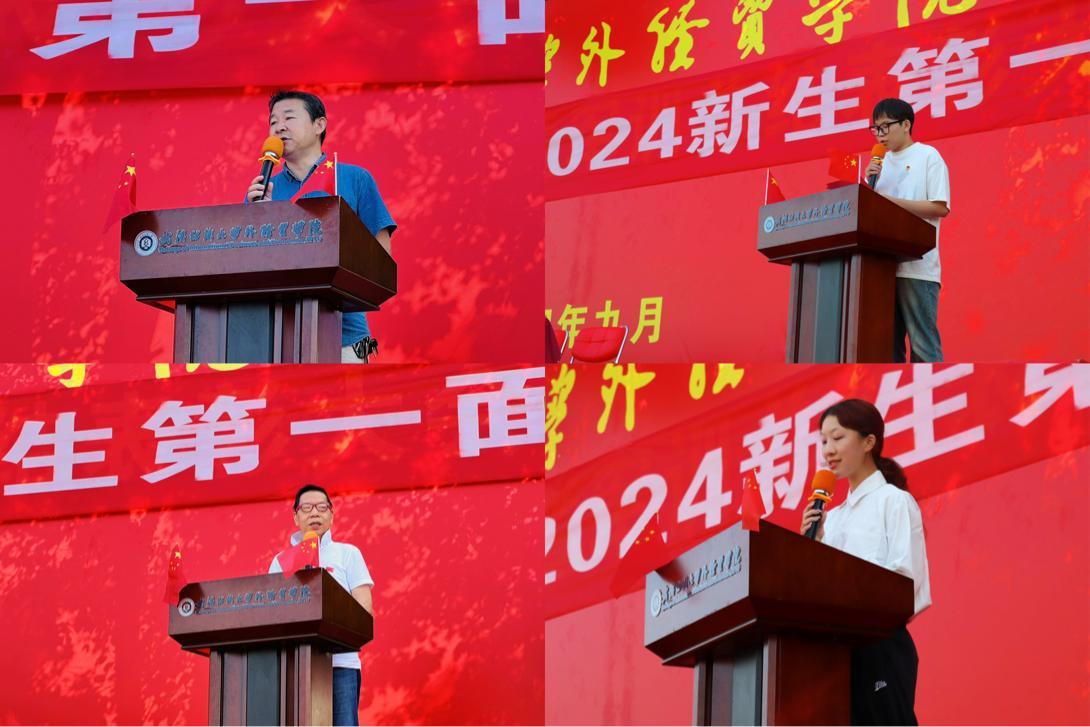 言辭鏗鏘展壯志,情感深沉訴衷腸,視覺傳達設計21級朱騰飛作為老生代表,分享了自己學習的經驗并送上了美好祝福。視覺傳達設計24級李奕辛作為新生代表,宣告了我們新的征程已經開啟!在他們的帶領下,藝術設計學部全體學生共同宣誓。接著,由新生標兵組成的方陣隊展現了精彩表演。同時,全體大合唱《我和我的祖國》,唱出對黨和祖國的無限熱愛,唱出對外經貿藝術設計學部的無限憧憬。