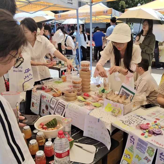 活動現場熱鬧非凡,多元業態精彩紛呈。現烤肉串的滋滋香氣、手工文創的精巧設計、特調飲品的創意混搭,各類特色攤位依次排開,每一件商品都凝聚著學子們的奇思妙想與創業熱情。同學們化身"創業攤主",從產品選型到攤位布置,從營銷推廣到客戶溝通,全程自主策劃、協同作戰,用鮮活的創意和務實的行動,讓校園集市充滿煙火氣與創造力。