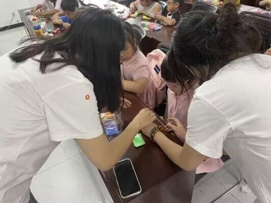 活動(dòng)伊始,團(tuán)隊(duì)成員姚澳,苗雨露以助教老師的身份開展科普專題視頻觀看和紅色知識問答活動(dòng),活動(dòng)過程中小朋友們興趣高昂,積極參與;隨后,在“盛夏物語 探索食品安全”課堂上,成員王穗穗,陳思含與老師共同組織粘土手工制作課堂,教授小朋友用彩色粘土制作精美的水果模型,孩子們在收獲樂趣的同時(shí)也學(xué)到了許多生活知識,開闊了想象力。最后,由老師播放兒歌,在歡聲笑語中,活動(dòng)圓滿結(jié)束。