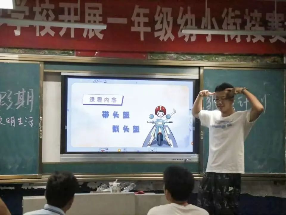 “盔”為頭盔,學生家長騎摩托車電動車接送學生上下學的路上,大多數家長都沒有佩戴安全帽的意識。更何況關于安全帽的基本種類,正確佩戴方式。隊員為同學們播放微課視頻,通過3D動畫場景的結合,運用物理原理,互動實驗講述了頭盔對人頭部保護的原理。