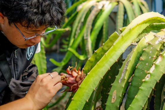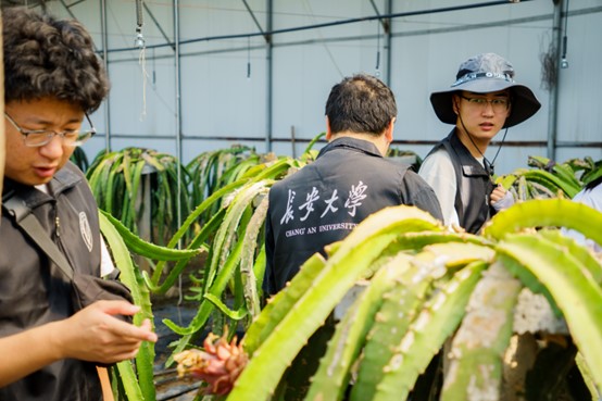 圖為長安大學赴山東淄博“探數(shù)字賦能,助鄉(xiāng)村振興”社會實踐團隊觀察火龍果生長狀況