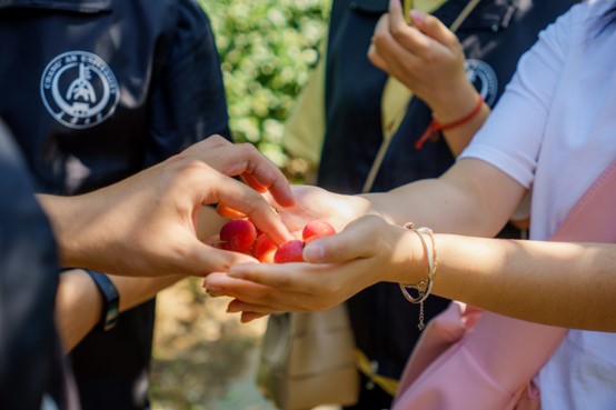圖為長安大學赴山東淄博“探數(shù)字賦能 助鄉(xiāng)村振興”社會實踐團隊互相分享采摘紅果