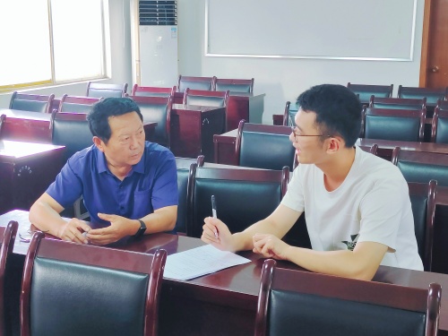 團隊教師葉雙休與村書記錢玉軍深入對話(左)、布霖種植專業合作社負責人蔡杰與團隊胡益交談(右)