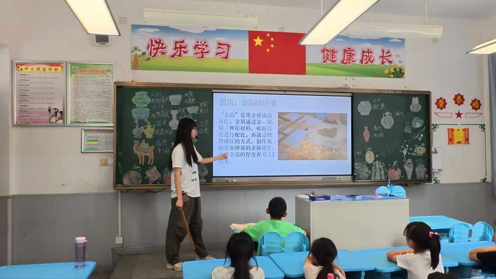 為擴大金箔文化的傳播范圍,實踐團還面向河南省的小朋友們開展了生動有趣的非遺金箔教學活動。團隊成員通過圖片展示、視頻講解、互動問答等方式,向孩子們介紹金箔的歷史淵源、制作工藝及文化價值,在他們心中播下傳承非遺文化的種子。