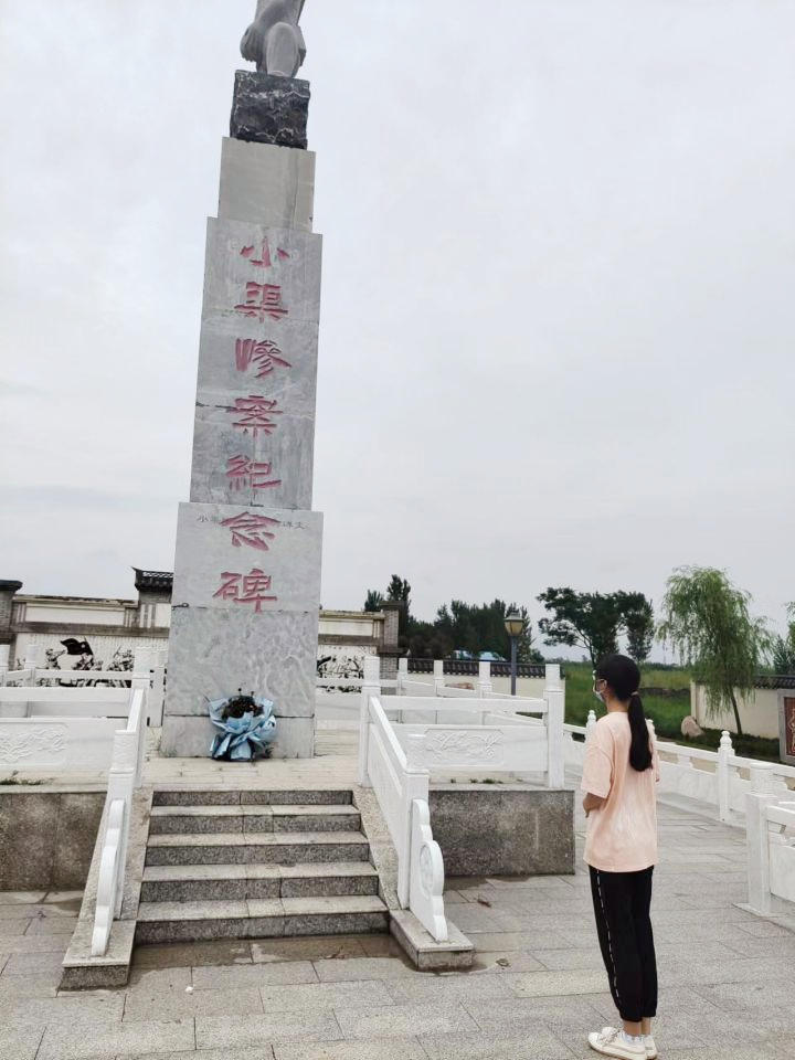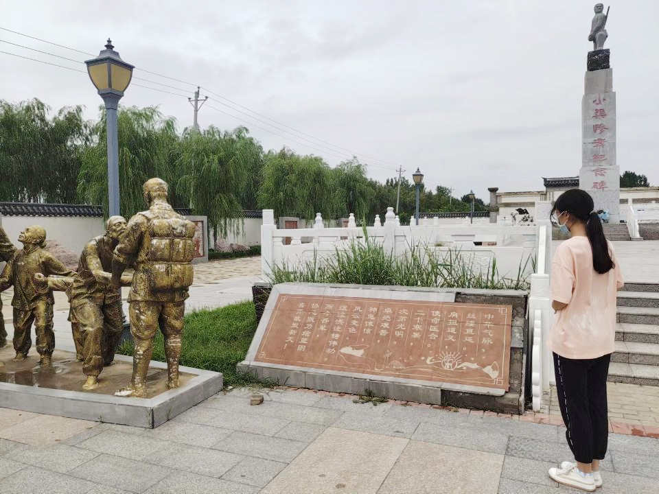 說長垣的黨史離不開趙堤,第一個農村黨支部成立于此;說長垣的抗日史離不開這里,這里發生過小渠抗日阻擊戰和小渠慘案;說長垣的解放史離不開這里,這里是濱河縣委縣政府所在地,被稱為長垣的“西柏坡”……小隊成員對1940年發生過小渠抗日阻擊戰的感受頗深。廣場的正中央是一座“小渠慘案紀念碑”,上方手持武器,時刻警惕敵人的戰斗英雄目光注視著遠處,時刻為戰斗而準備著。廣場盡頭有一幅描述“小渠慘案”的場面,讓小隊成員深刻地感受到戰爭的殘酷和人民的反抗。