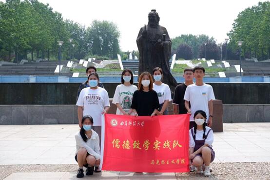 圖為實踐隊員在曲阜師范大學校內孔子像前合影。中國青年網通訊員 馬欣臻 攝