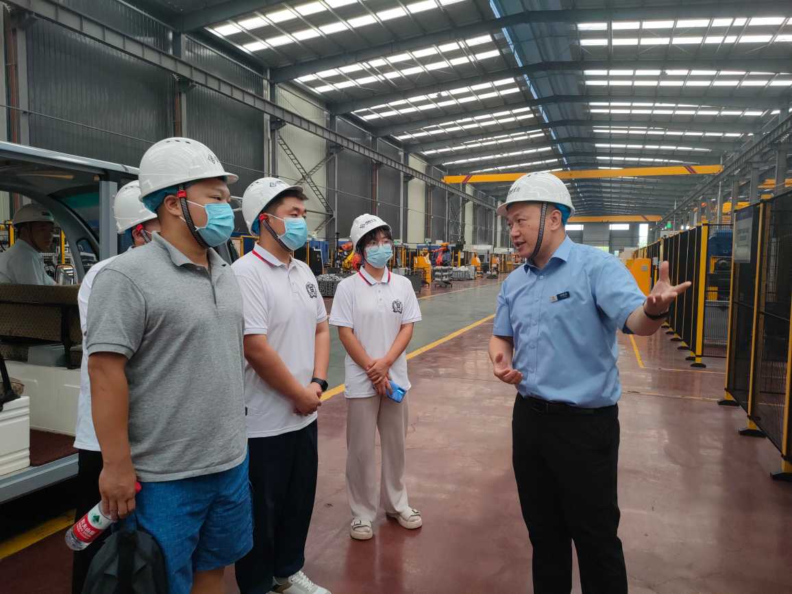 在銷售部林部長的帶領下,實踐調研團近距離觀察自動化設備運行,參觀并了解了各個不同類型車間內的生產制造情況。“發展是硬道理,質量是生命線”“建設綠色企業,堅持綠色經營”……隨處抬頭可見的中英文標語,激勵著企業員工保持著精益求精的工作態度,又展現出企業的發展追求。林部長說:“礦山集團專注起重機研發制造,打造生產自動化、設備智能化、設計數字化的起重裝備高端智能制造基地,致力于做起重機產業智能、綠色、高質量發展的引領者。”交流座談會上,實踐調研團觀看了企業宣傳片,再次感受到企業的雄厚實力。隨后,礦山集團岳總簡要介紹創始人的創業過程,并針對實踐隊員的提問,就專精特新內容的體現與綠色創新的效益展開詳細敘述。馬主任與林部長則就技術工人培養、市場銷售狀況等作具體講解。