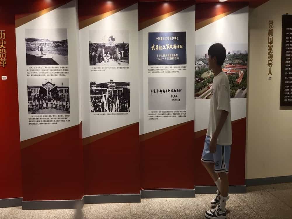 進入館內,一幀幀灰白照片向里無限延伸,紅繩圍住的英雄蠟像,玻璃展柜里靜置的文件舊物,墻壁上懸掛的鋪滿蠅頭小楷的泛黃紙張,無聲訴說的是那段曲折而偉大的歷史,帶領每一個館內游客撥開歷史的濃霧,回到硝煙與熱血籠罩著的過去。在歷史沿革板塊前,隊員們駐足閱覽,不無感慨。隊員彭柯皓表示,“很高興能有這次機會來到武昌起義軍政府舊址,站在這里,我仿佛看到了百年前滿懷救國信念,不畏犧牲,奔走在槍林彈雨中的中國青年。”