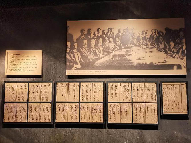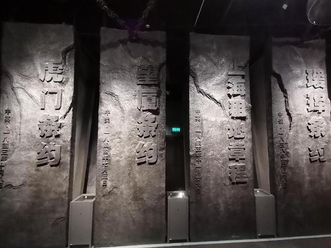 實(shí)踐隊(duì)隊(duì)員們走進(jìn)展廳入口,首先看見的是用大量珍貴文物、歷史照片還原的“晚清中國(guó)”歷史場(chǎng)景——在昏暗冷清的燈光下,走道兩邊的墻壁上一塊塊石碑重現(xiàn)著晚清時(shí)期列強(qiáng)脅迫清政府簽訂的一系列不平等條約。古今多少蒼茫事,前車歷歷未能忘。在這莊重嚴(yán)肅的場(chǎng)景下,我們依稀可見當(dāng)年王朝垂暮、喪權(quán)尋國(guó)、日甚一日,社會(huì)動(dòng)落、民生維展的情景。