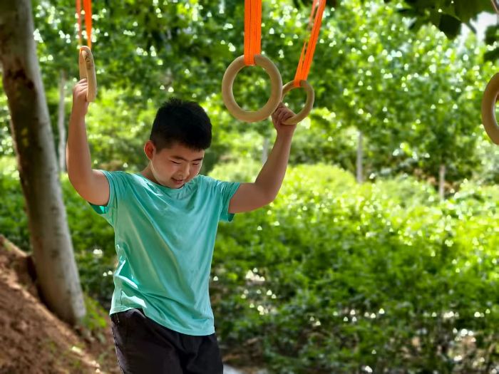 上午,同學們分為兩隊,在黑叔的指導下展開了“撒野大闖關”六關挑戰。匍匐越障時,大家在沙地上奮勇爭先,膝蓋抵著沙粒,身體緊貼地面,卻把困難變成了歡樂的游戲;攀樹鳴金環節,每向上一步都離不開手腳并用,老師的托舉與同伴的鼓勵化作自信的搖鈴聲,滿載著驕傲;輪胎接力中,沉重的輪胎和漫長的賽道沒能阻擋前進的腳步,隊友的期盼眼神與吶喊讓頑強的腳步愈發輕快;懸輪競速考驗著力量與耐心,孩子們全神貫注的純粹比速度更顯珍貴;鉆桶競速像一場童年探險,在黑暗中堅持前行,終會遇見光明;箭術爭勝時,孩子們化身小小弓箭手,“9環!10環!”的吶喊聲中,藏著被擊中的童年夢想