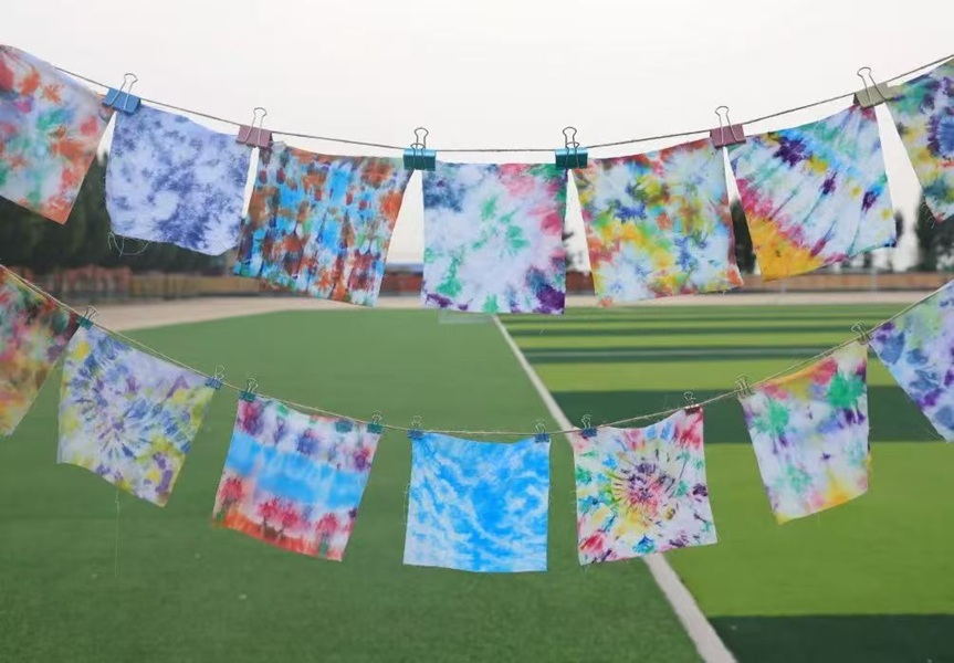 大家共同動手體驗扎染制作,從選裁布料、系扎繩結、浸泡染液、晾曬固色、整理成型,一塊塊布料在小朋友們手中綻放出獨特的扎染風景——流動色彩與變幻紋樣,是童真撞匠心,亦是傳統在指尖開花。