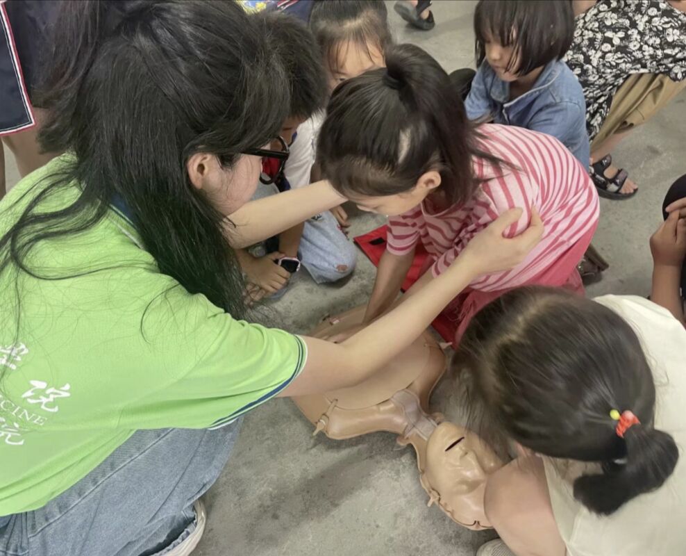 圖為志愿隊的夢夢老師指導學生做胸外按壓的正確姿勢。湖北醫藥學院 張昊哲 供圖