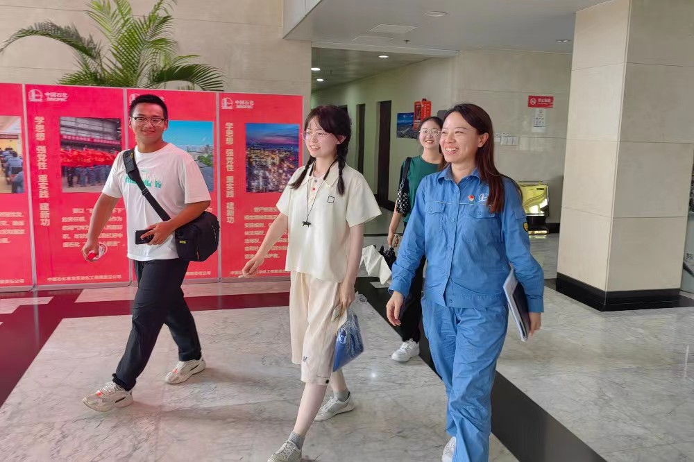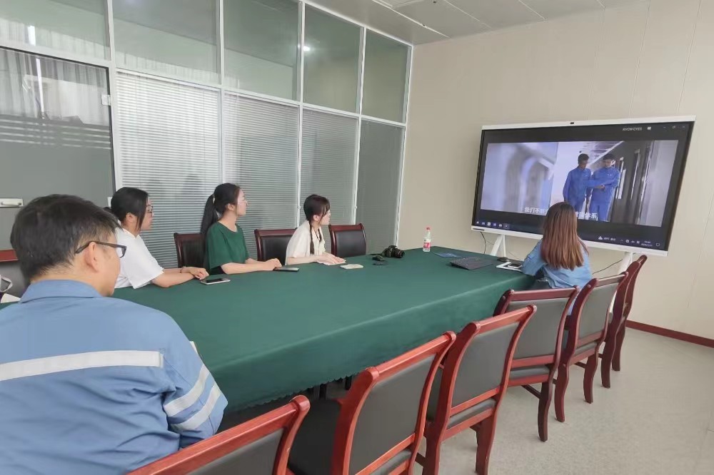 在會議室內,實踐隊隊員針對青島煉油公司的綠色發展理念和所做的措施進行了解學習。技術負責人熊炳堅就“減油增化”、“減碳降排”兩個核心理念展開了詳細的介紹。在“減油增化”方面,青島煉化最新建成的光伏停車場在停車場上覆蓋了光伏板,將太陽能轉化為電能,提供給建筑物或電網使用,為停車場和附近的建筑物提供清潔可再生的電力,同時減少了對于油氣的依賴,降低了碳排放。在“減碳降排”方面,青島煉化是青島第一家,也是現在唯一一家生產燃料電池氫的企業。負責提供西海岸新區所有加油站所需的燃料電池氫。且可以通過“綠電制綠氫”和甲烷化的技術,使燃料電池氫的純度達到99.99%的最高標準,是真正的綠色無污染。