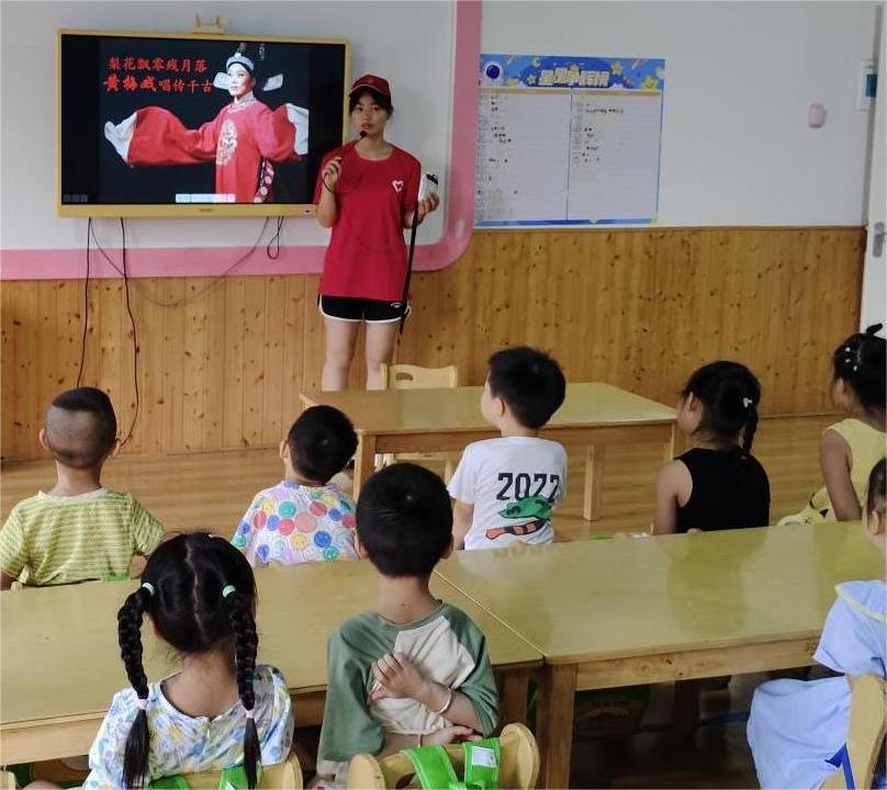 了解黃梅戲,發現黃梅戲8月1日上午,實踐隊員赴安徽省安慶市懷寧縣黃墩鎮晨光幼兒園開展黃梅戲進校園活動。懷寧縣作為黃梅戲發源地京劇前身徽劇的發祥地,素有“戲曲之鄉”,具有濃厚的戲曲文化氛圍,實踐隊員程怡圍繞黃梅戲的起源和發展歷程向小朋友們作介紹:黃梅戲與京劇、越劇、評劇 、豫劇并稱“中國五大戲曲劇種”,也是安徽省的主要地方戲曲劇種,包括正旦、正生、小旦、小生、花旦、小丑、老旦、老生、花臉、刀馬旦、武二花等,讓孩子們對黃梅戲有了初步的了解,并且就“身邊的黃梅戲”這一話題與孩子們進行交流,激發孩子們對黃梅戲相關知識的學習熱情,引導他們對身邊的黃梅戲文化進行發掘,孩子們積極列舉身邊的黃梅戲:像是爺爺奶奶嘴里時常哼唱的小調,電視上的節目,鄉村戲臺上的演出等。