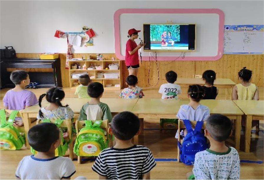 欣賞戲曲之美,感受黃梅古韻8月2日上午,實踐隊員為幼兒園小朋友們播放黃梅戲片段,包括《女駙馬》、《天仙配》、《打豬草》等經典曲目,隨著戲曲的腔調,孩子們不自覺的跟隨哼唱,對于其中的名句,甚至能夠清晰地跟唱。此外實踐隊員還向孩子們簡短介紹了戲曲的背景故事,孩子們被《天仙配》中董永和七仙女的不畏強權,勇敢追求愛情的精神打動,也為《女駙馬》中主人公不被封建思想束縛,不為世人看法所影響,努力追求自己幸福的品質所感染,希望能了解更多的黃梅戲曲目。實踐隊員通過寓教于樂的方法,讓孩子們對傳統黃梅戲曲目產生興趣。