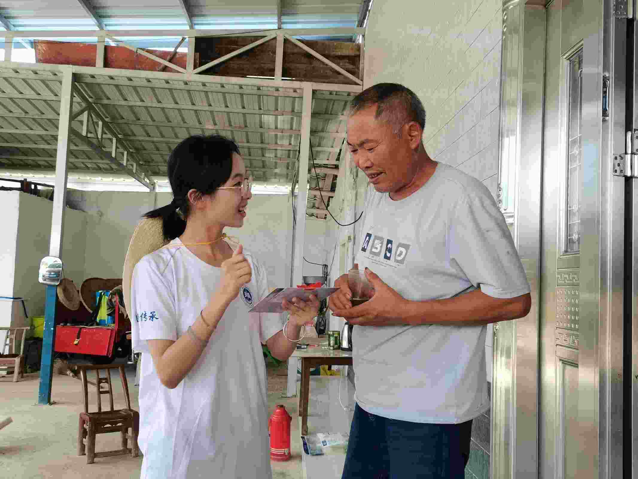 在走過一戶門前曬滿藥用木瓜的農戶時,實踐隊與村民進行了交談,并且贈送了如何緩解頭痛、如何緩解咳嗽的健康知識宣講小賀卡以及夏季避暑小禮包。村民激動的說到:“你們都是學以致用的好學生,是有醫德的醫學生!相信你們的未來肯定是大有可為的!”翻越了一座山,實踐小隊遇見一位身體硬朗健談的老爺爺,隨后與這位老爺爺進行了送物資賀卡與訪談。當老爺爺了解到我們是醫學生后說“你們愿意來到山村里,對我們宣講醫學常識,是好樣的!”