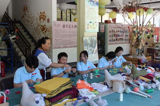 宣講團成員通過與非遺工坊負責人進行交流,了解到通過制作非遺產品,讓當地多數婦女在閑暇時間有了經濟收入,不僅僅是對非物質文化遺產進行了傳承和創新,也帶動了當地的收入。在參觀和交流后,宣講團成員親身體驗制作非遺產品“布老虎”,通過制作感受到了手工制作產品的辛苦,同時通過勞動也深深感受到了非遺文化的魅力。
