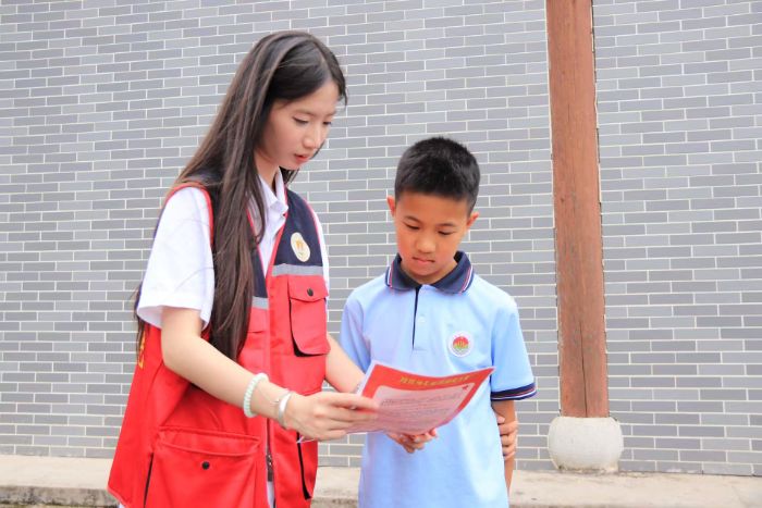 (圖為服務隊成員向當地居民分發紅色宣傳單并介紹)